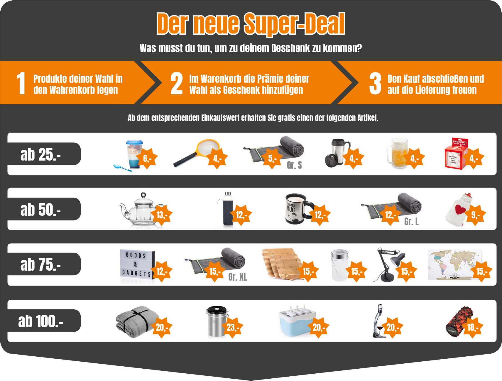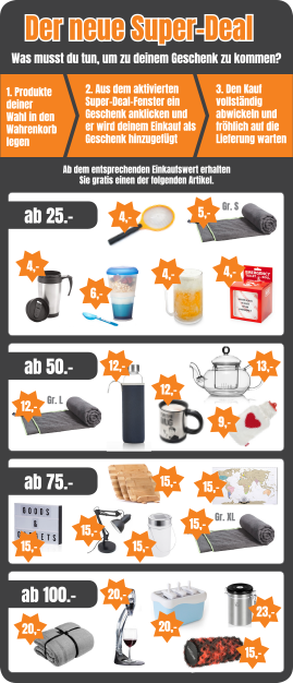 Spannende Gadgets für den Alltag, einfallsreiches für die Freizeit und belustigendes für die nächste Party, all das liefert dir Geheimshop.de schon lange. Aber weil wir unsere Kunden lieben, gibt es jetzt etwas neues: Wir verschenken ab sofort mit jeder Bestellung ab EUR 25.- tolle Prämien mit einem Wert von bis zu 25% des Bestellwerts. Komplett gratis! Ja richtig gehört: Komplett gratis und als Dankeschön geschenkt. Da die Nachfrage vermutlich riesig sein wird, bitten wir darum, dass gelegentlich bestimmte Bonusprämien vergiffen sein werden. Wir füllen die Lager schnellstmöglich auf, bzw. passen die Auswahl an. Und nun viel Spaß beim Shoppen!